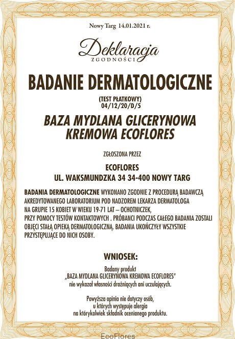 Badania dermatologiczne - Deklaracja - Baza Mydlana Kremowa Ecoflores